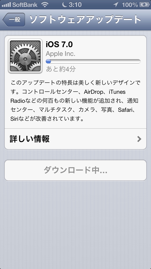 で、待つ。ダウンロードが終わっても、そのあとでアップデートの準備とか、実際のアップデートでかなり時間がかかるので、待つ。